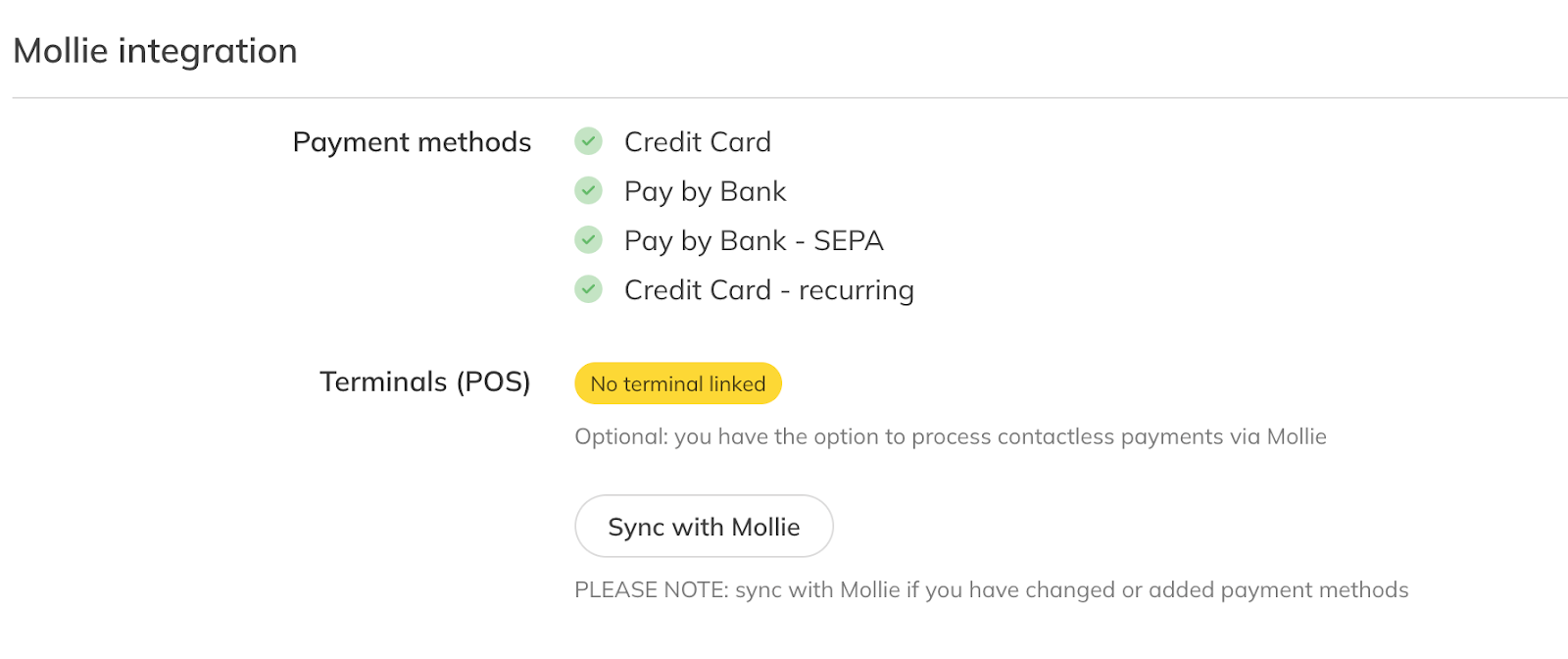 – If you activated additional payment methods after connecting, click “Sync with Mollie”.