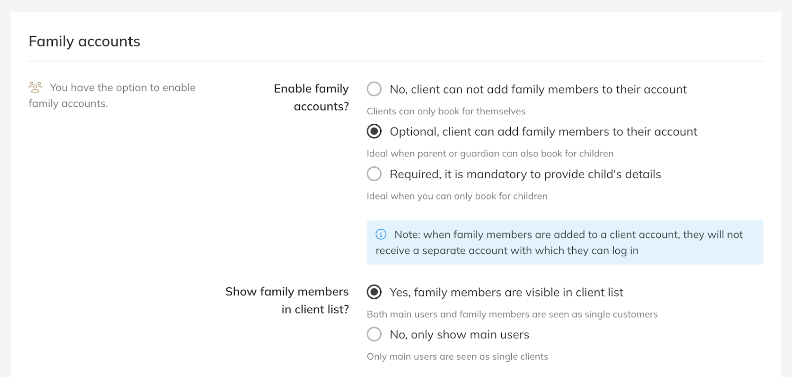 – Choose whether clients are allowed to add family members to their account. You can set this as optional or required depending on your business setup.