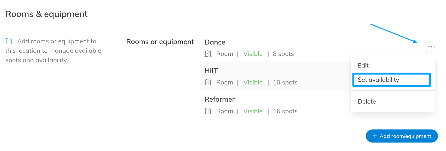 – Set when the room or equipment is available for booking to prevent scheduling conflicts. Go to the button on the right side of a room/equipment > set availability.