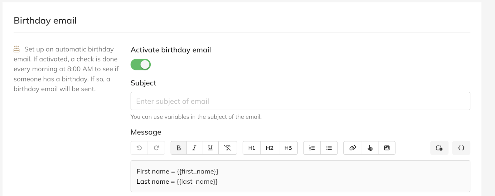 – Set up an automatic birthday email. If activated, the system checks every morning at 8:00 AM if any client has a birthday. If so, a birthday email will automatically be sent.