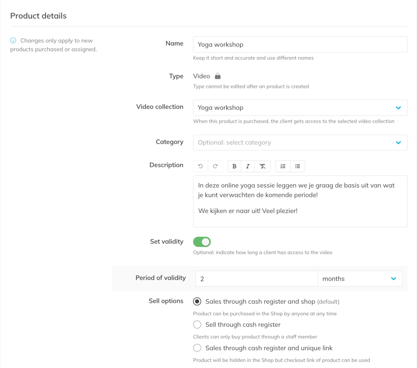– Add a clear description. Then select the correct video collection and choose a category (if used). To finalize this step: Add access duration, upload a photo for the Shop and set the price including the VAT percentage.