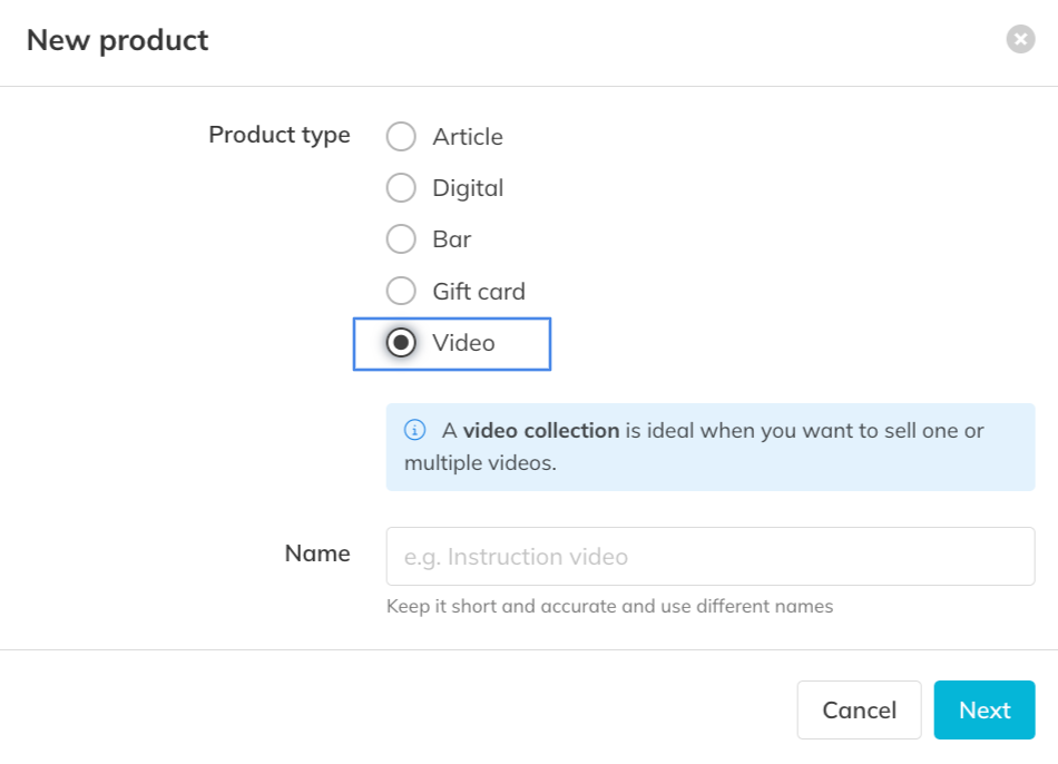 – Go to My Company > Products and click on ‘Retail, bar, videos & gift cards’ and create a new item: Select ‘video’. This product will represent access to (one of) your Video Collection(s).