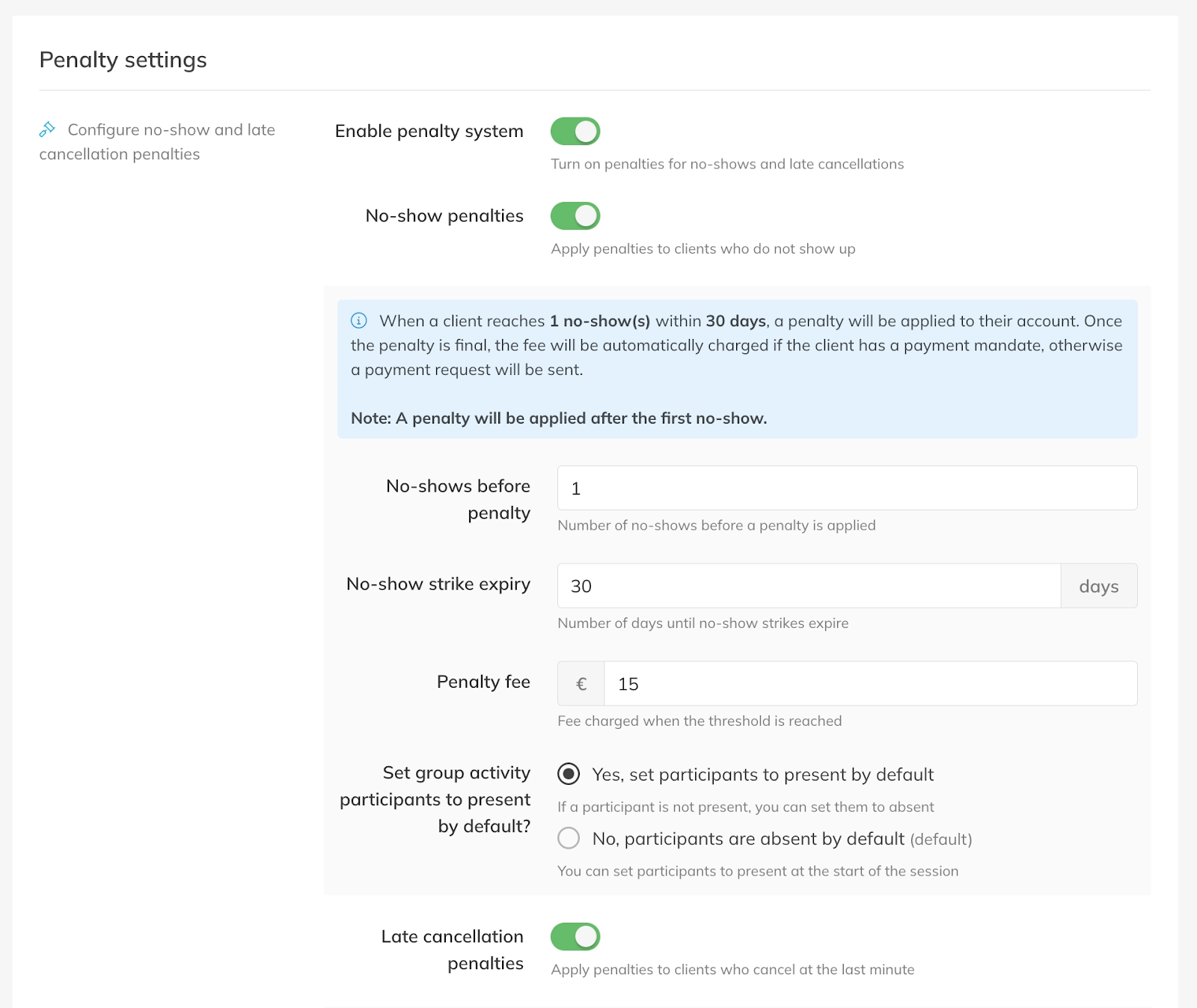 Automated penalties allow you to charge clients when they miss an Activity (no-show) or cancel too late.