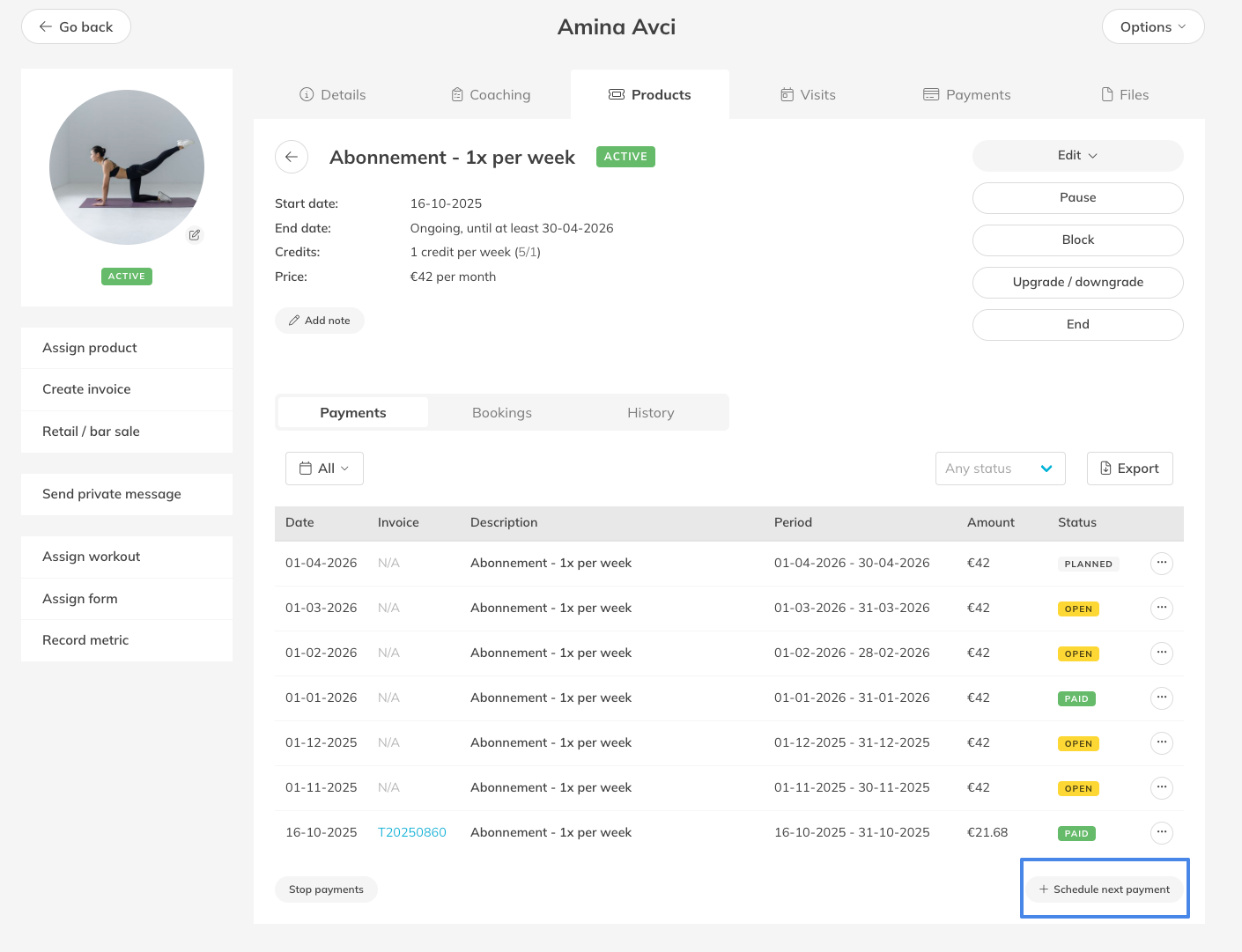 Trainin automatically schedules Membership payments one period in advance based on the billing cycle. However, you can manually schedule the next planned payment if you need to modify or manage payments further in the future.