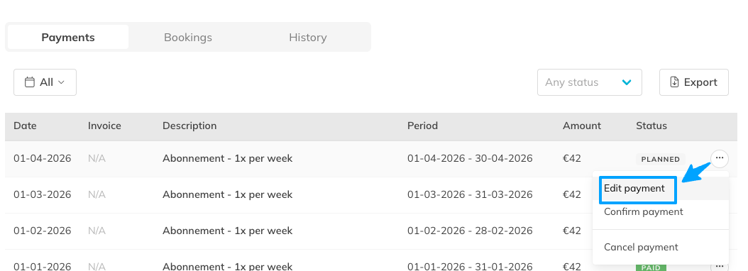 – If you need to adjust the payment date or billing period, you can edit the planned payment after it has been created. Please note that the end date of the order period determines the date of the next payment.