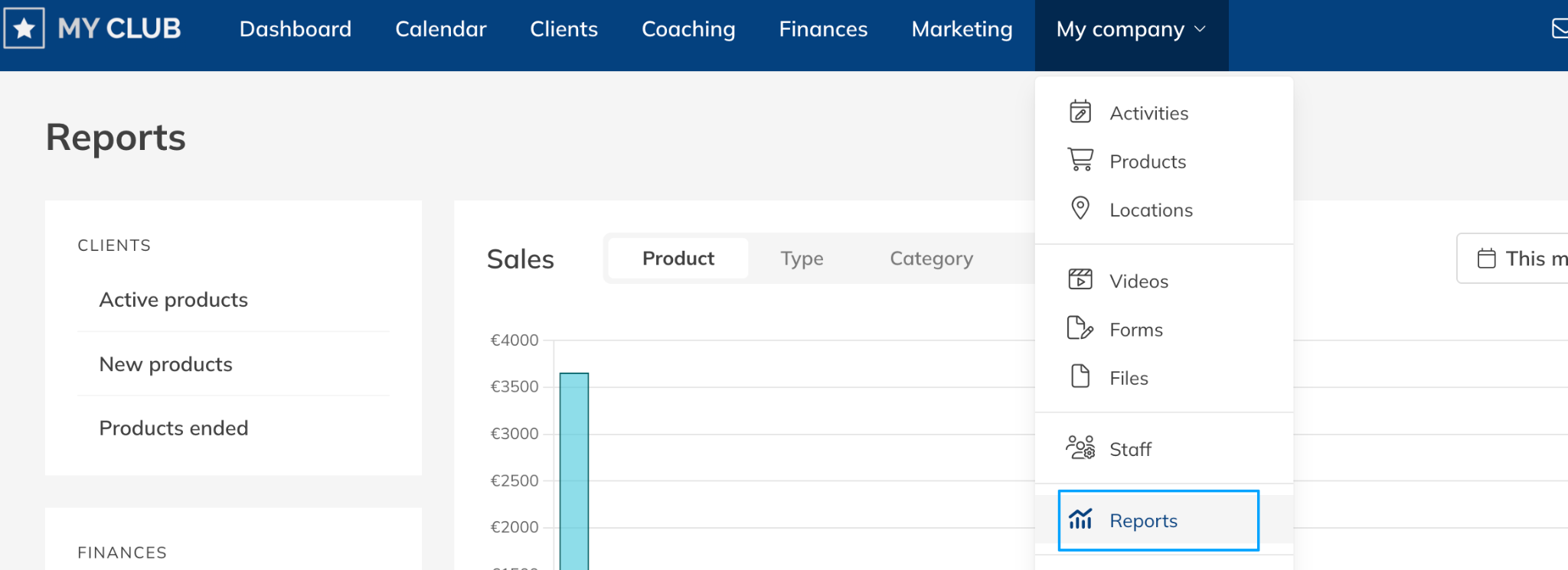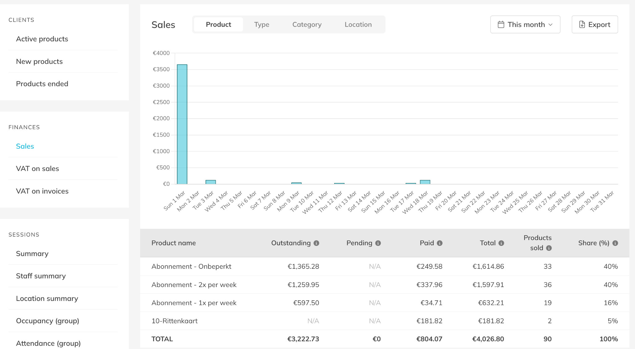 The Reporting section in Trainin provides financial insights that help you understand your sales performance. You can review revenue per Product, track payment statuses, and analyze sales trends over a selected timeframe.