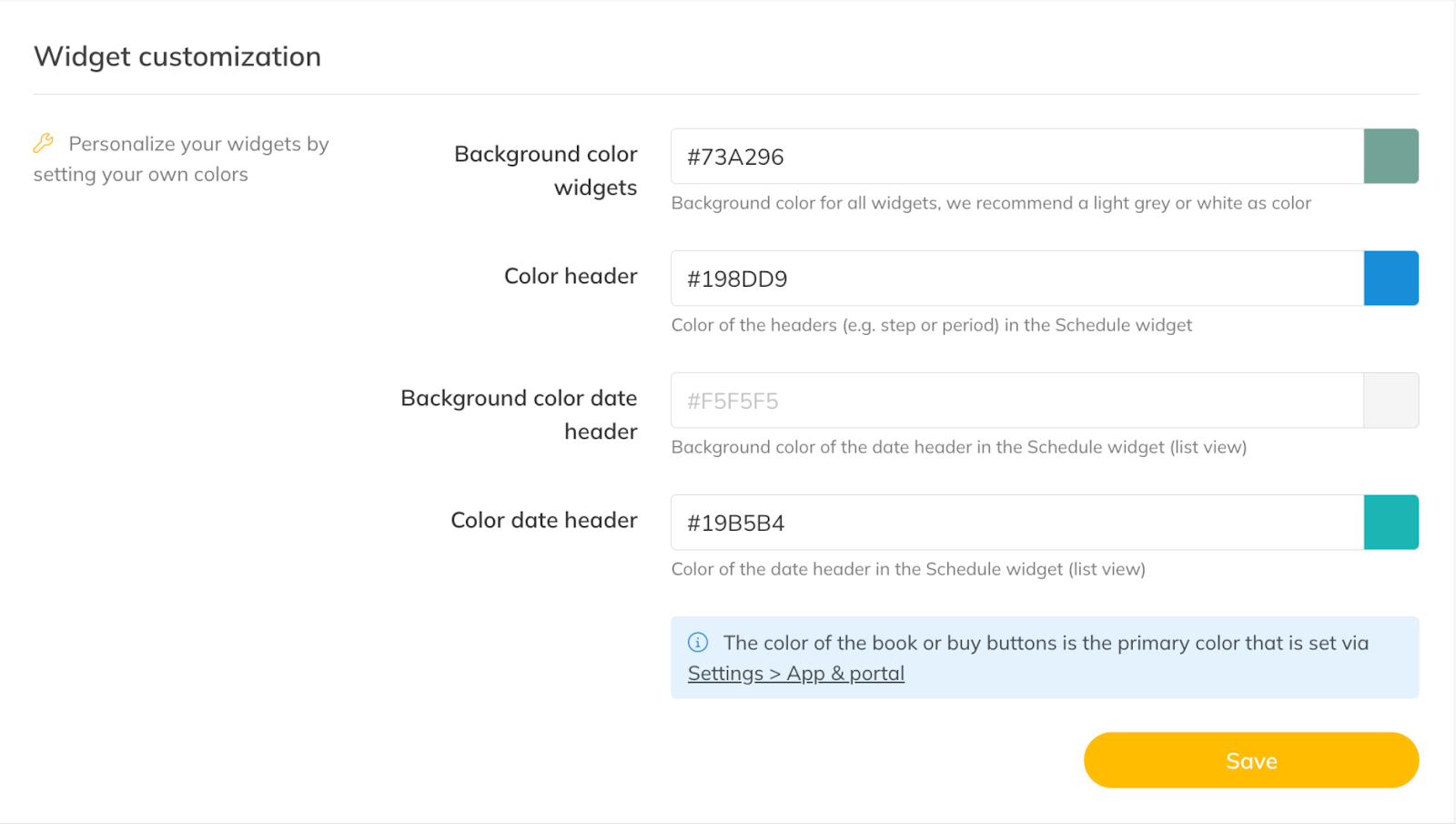 Trainin allows you to adjust colors used in widgets, including the Schedule header and the booking and purchase buttons, creating a consistent experience for your clients.