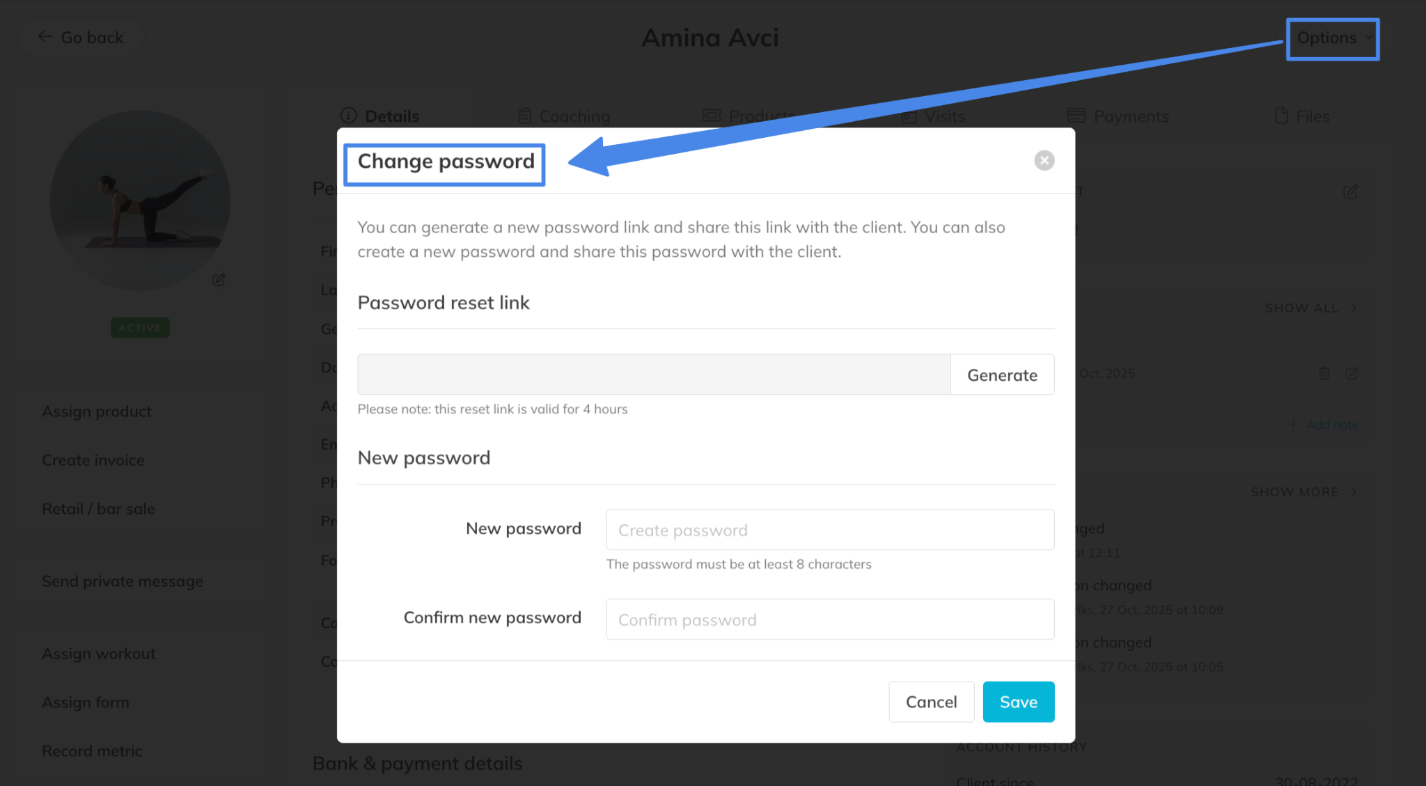 – Or you can re-send the welcome email using the ‘options’ in the client account. This will send a new welcome email with a newly generated password and a link to the client portal.