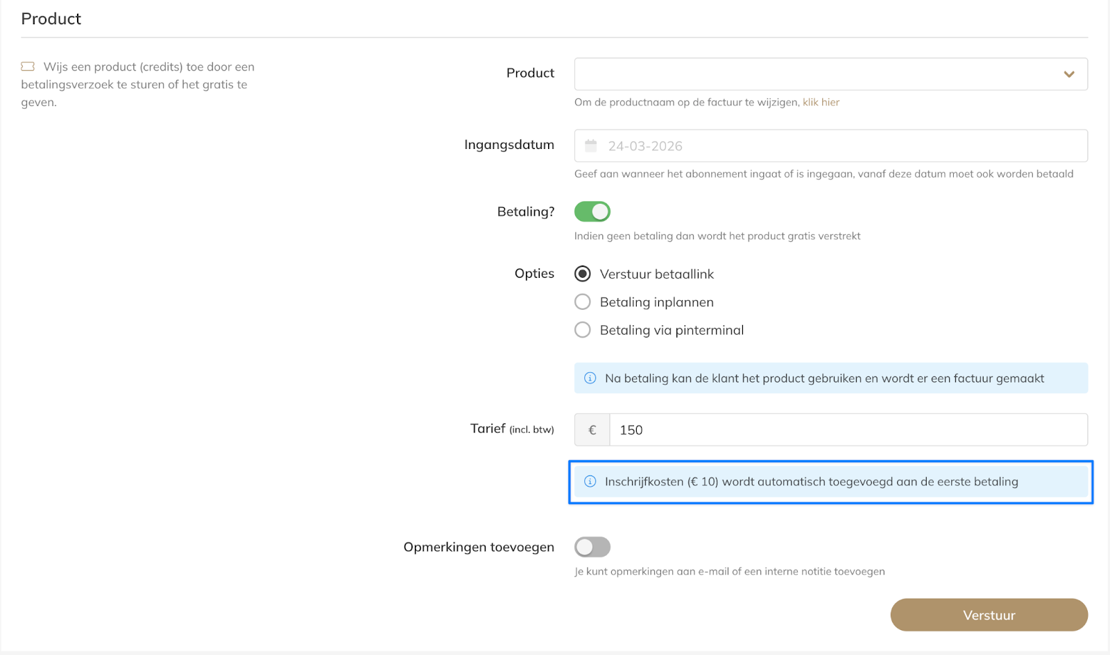 – Bij het aanmaken van een nieuw product voor een klant worden de inschrijfkosten toegevoegd aan de eerste betaling, zodat de eenmalige kosten aan het begin van het Abonnement worden berekend.