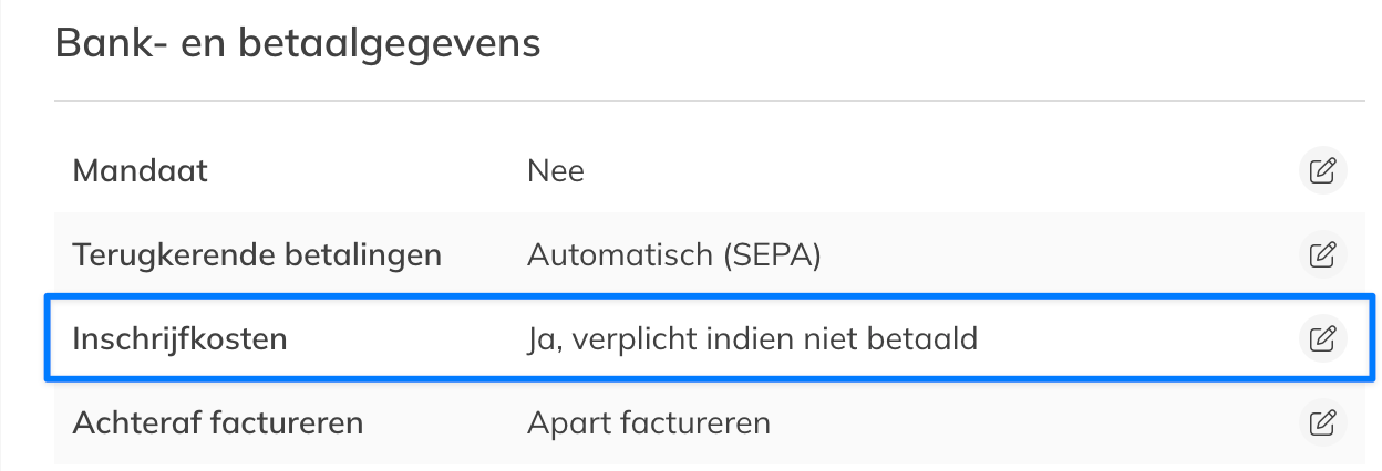 Stap 4: Sluit de inschrijfkosten uit voor een specifieke klant (optioneel): Klantaccount > Details > Bank- & betaalgegevens > Inschrijfkosten
