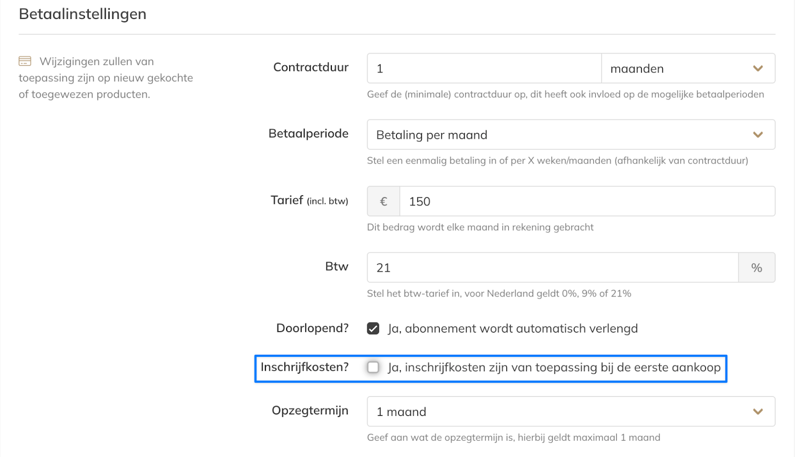Je kunt eenmalige inschrijfkosten toevoegen aan een Abonnement door dit in te stellen in je Product-instellingen.