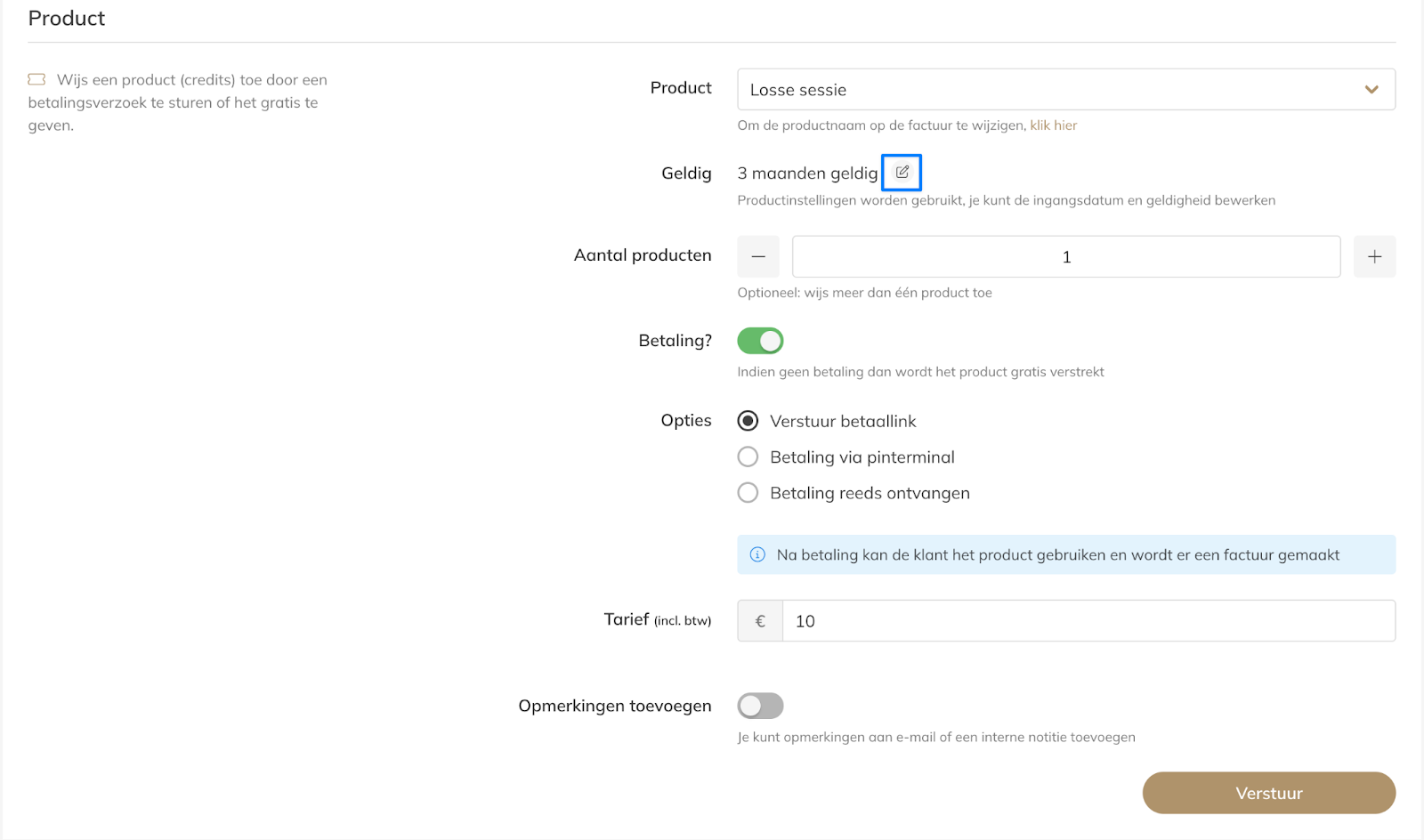 Hierdoor kan je een abonnement, rittenkaart of losse sessie handmatig activeren en bepalen hoe en wanneer de klant moet betalen.