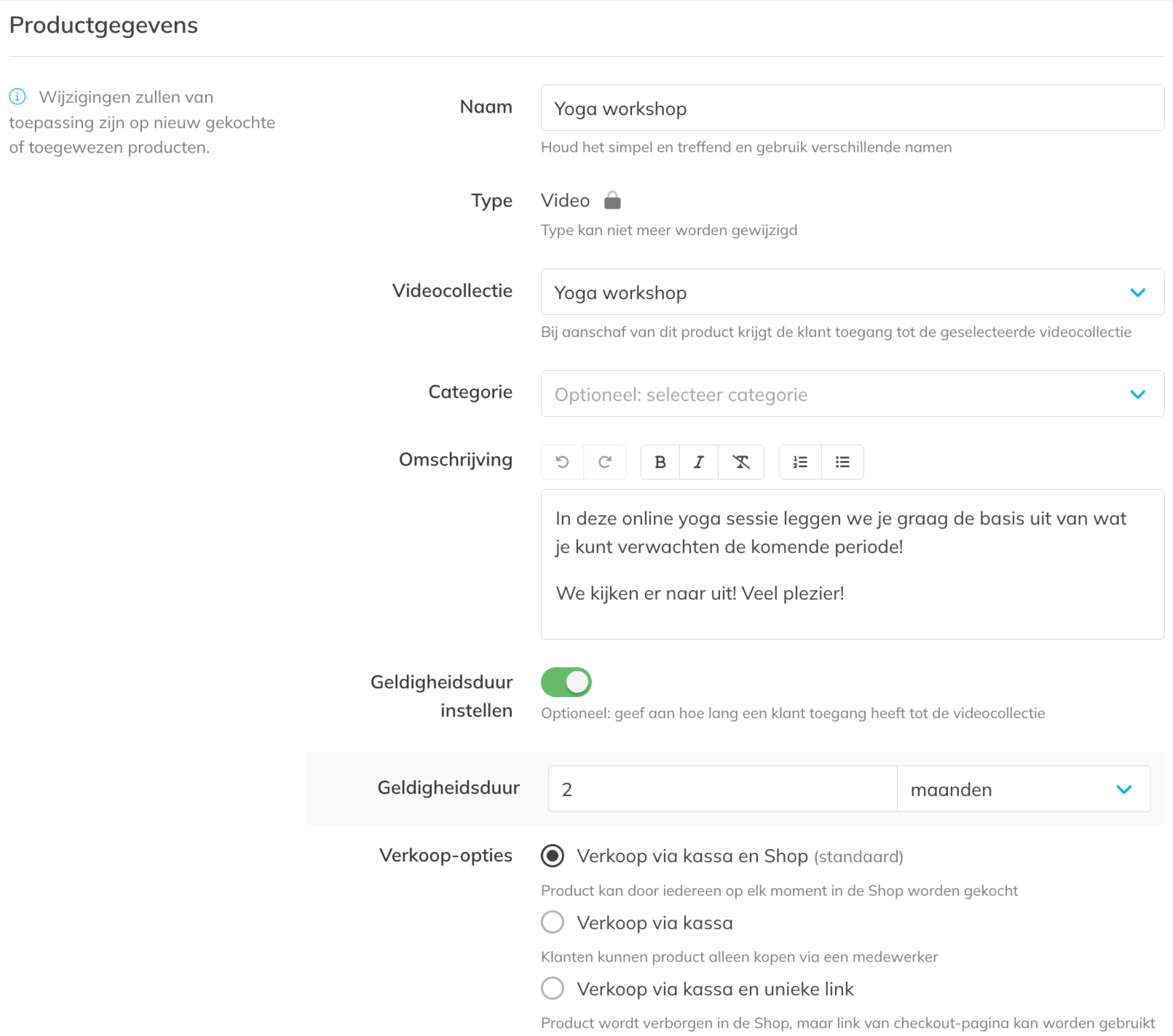 – Ga naar Mijn bedrijf > Producten,klik op ‘Retail, bar, video’s & cadeaubonnen’ en maak een nieuw item aan: selecteer ‘video’. Dit product vertegenwoordigt toegang tot (één van) je video collectie(s).