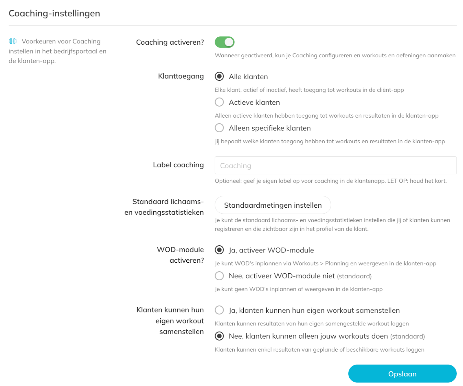 Door deze module in te schakelen en de voorkeuren te configureren, kun je bepalen welke metingen worden gevolgd en hoe trainers en klanten met coachingdata werken.