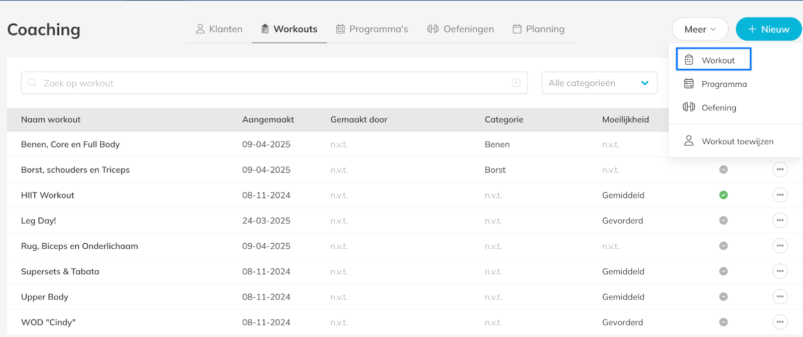– In deze sectie kun je workout templates voor je klanten maken en beheren.