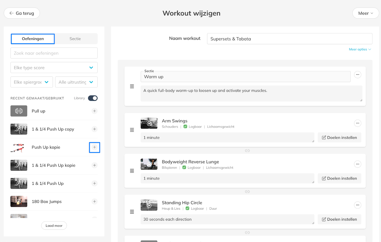 Combineer oefeningen uit de standaard oefenbibliotheek met aangepaste oefeningen die specifiek zijn voor jouw trainingsmethode.