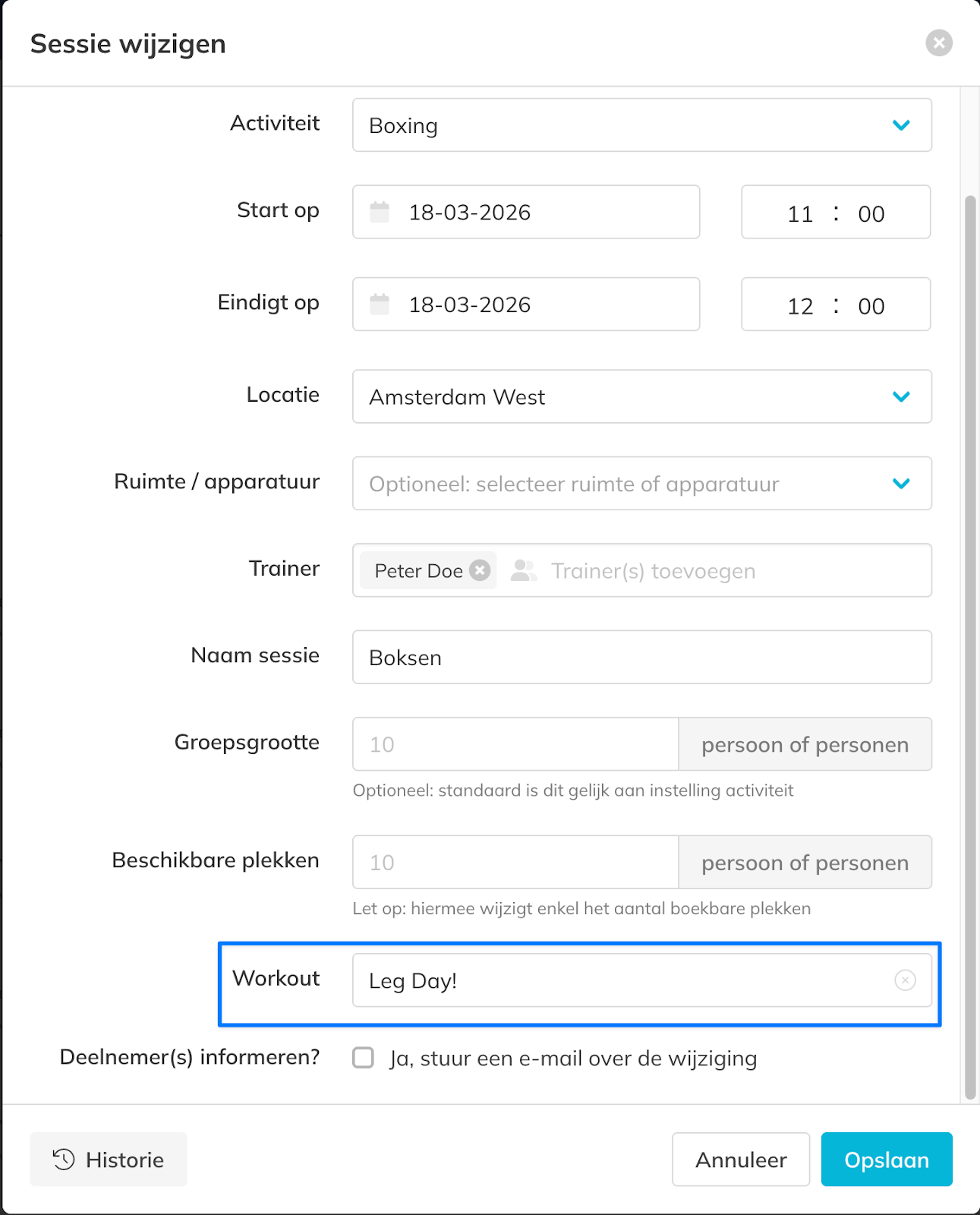 – Kies de workout die de deelnemer(s) tijdens de sessie moeten uitvoeren.