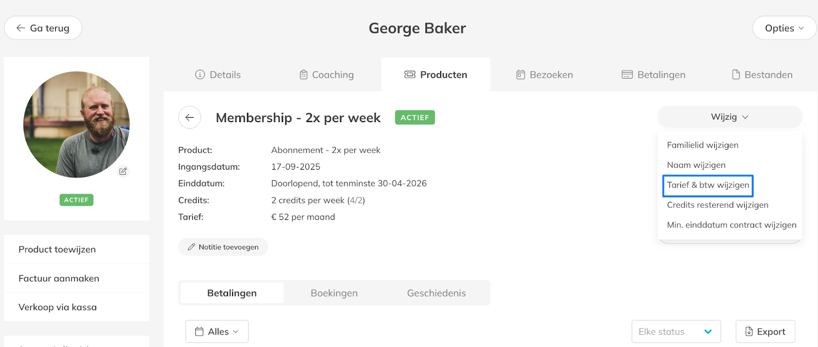 Stap 4: Wijzig de abonnementsprijs: Producten > Opties > Wijzig Tarief & BTW