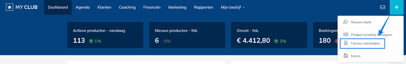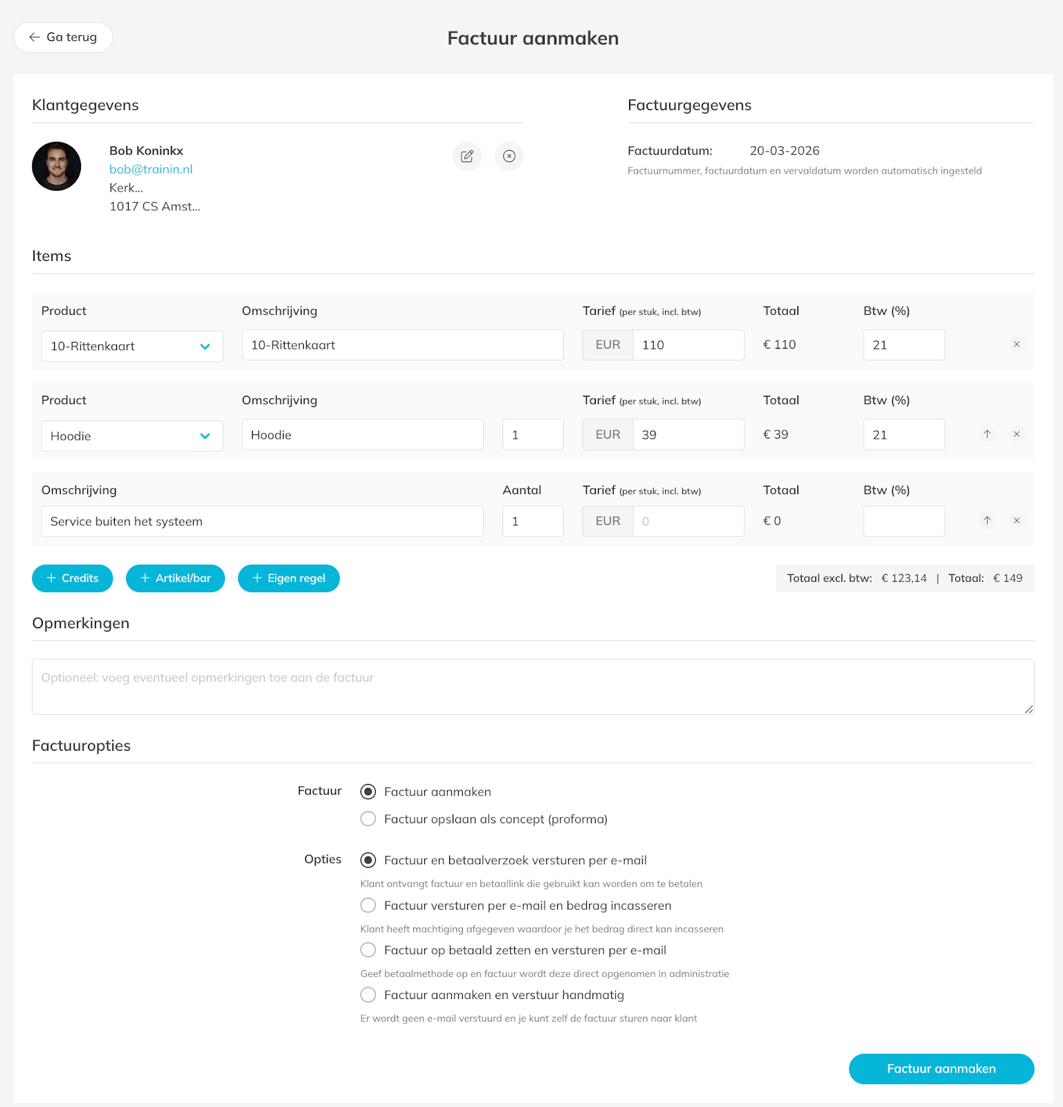 Stap 4: Klik op ‘factuur aanmaken’ en verstuur deze naar de klant of sla de factuur op voor je eigen administratie. De klant kan deze factuur ook terugvinden in zijn klantaccount.