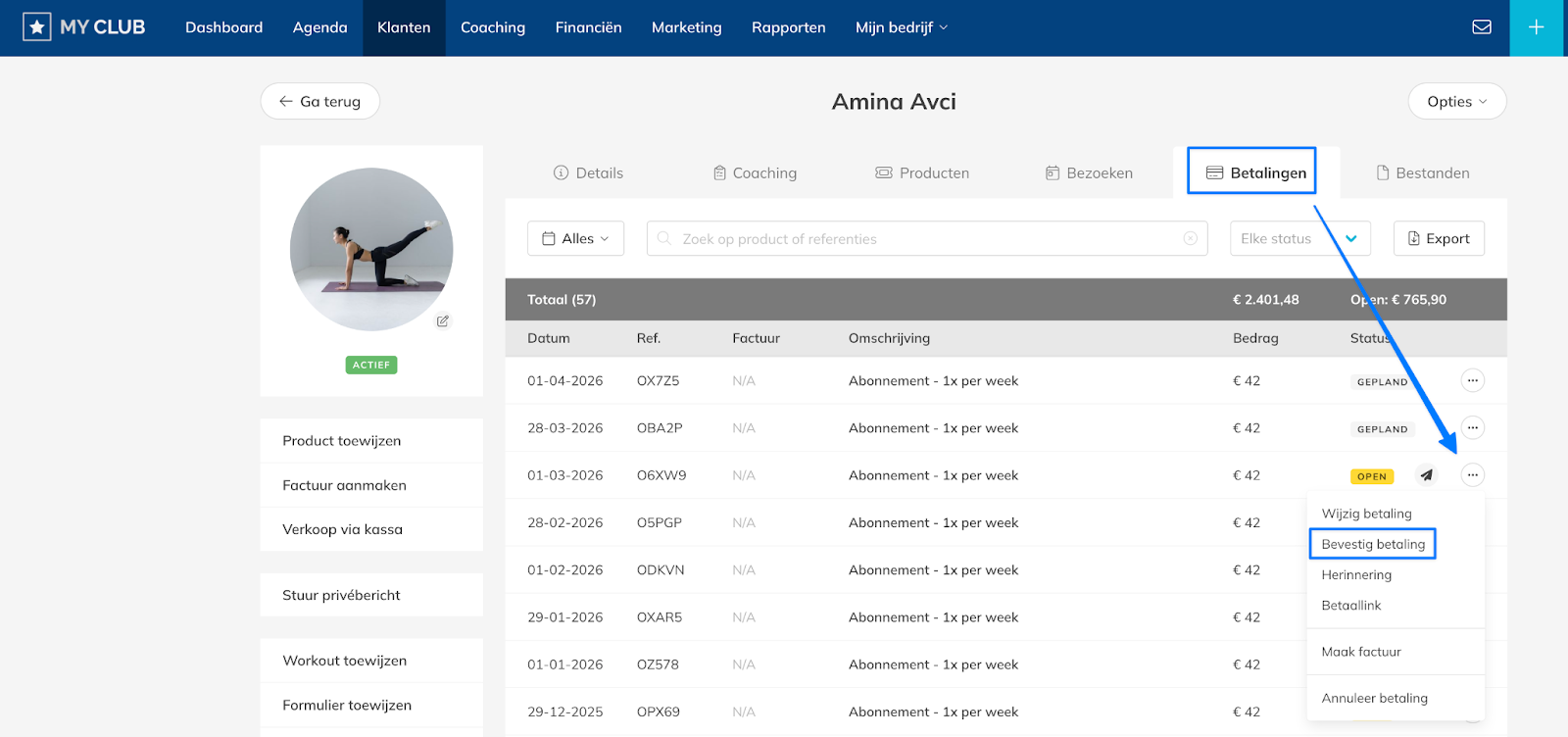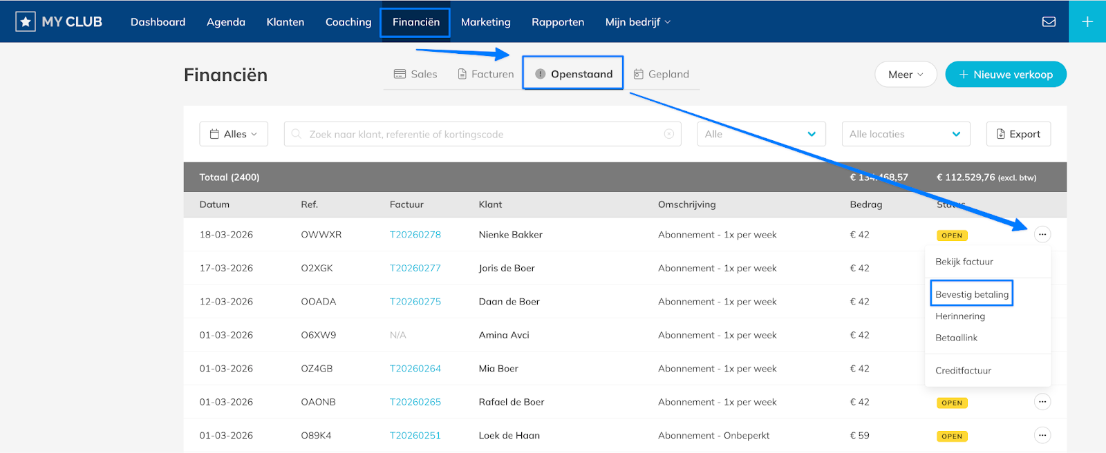 Markeer een openstaande betaling alleen als betaald wanneer je zeker weet dat je het geld hebt ontvangen (niet wanneer iemand zegt dat er al is betaald). Wanneer iemand via Trainin/Mollie betaalt, wordt de betalingsstatus automatisch bijgewerkt zodra de betaling is voltooid.
