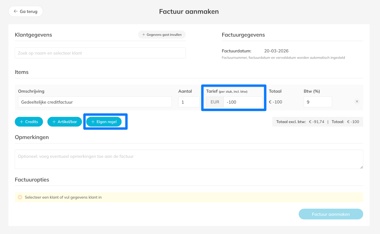– Voer het bedrag dat gecorrigeerd moet worden in als een negatieve waarde. Dit creëert een gedeeltelijke creditnota die een deel van de oorspronkelijke factuur corrigeert.