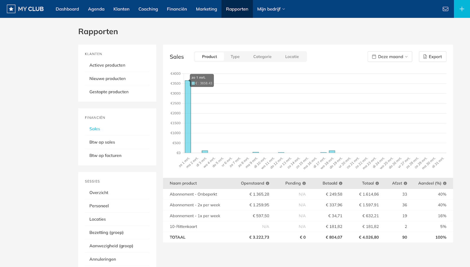 – Het rapport toont omzet per product, het aantal verkochte producten en betaling statussen zoals Openstaand, Pending en Betaald.